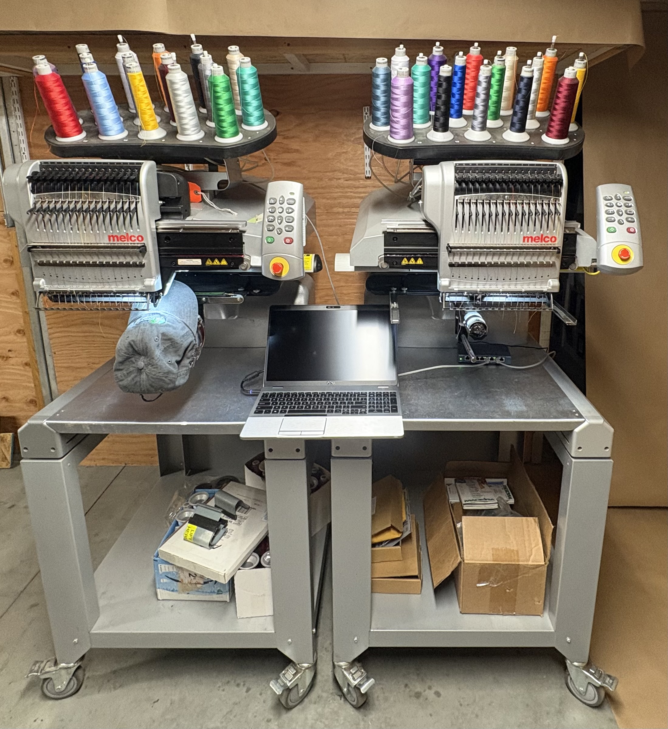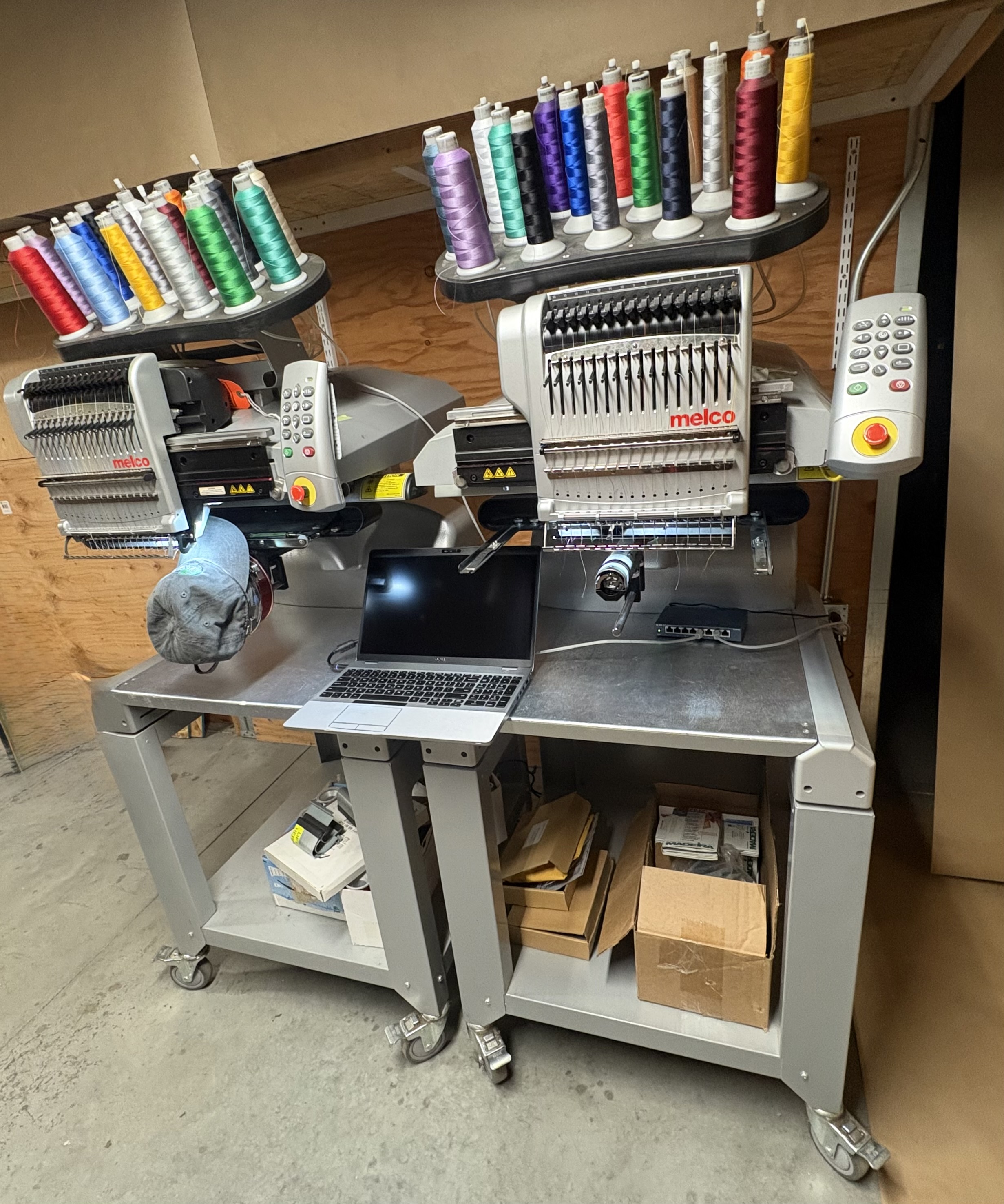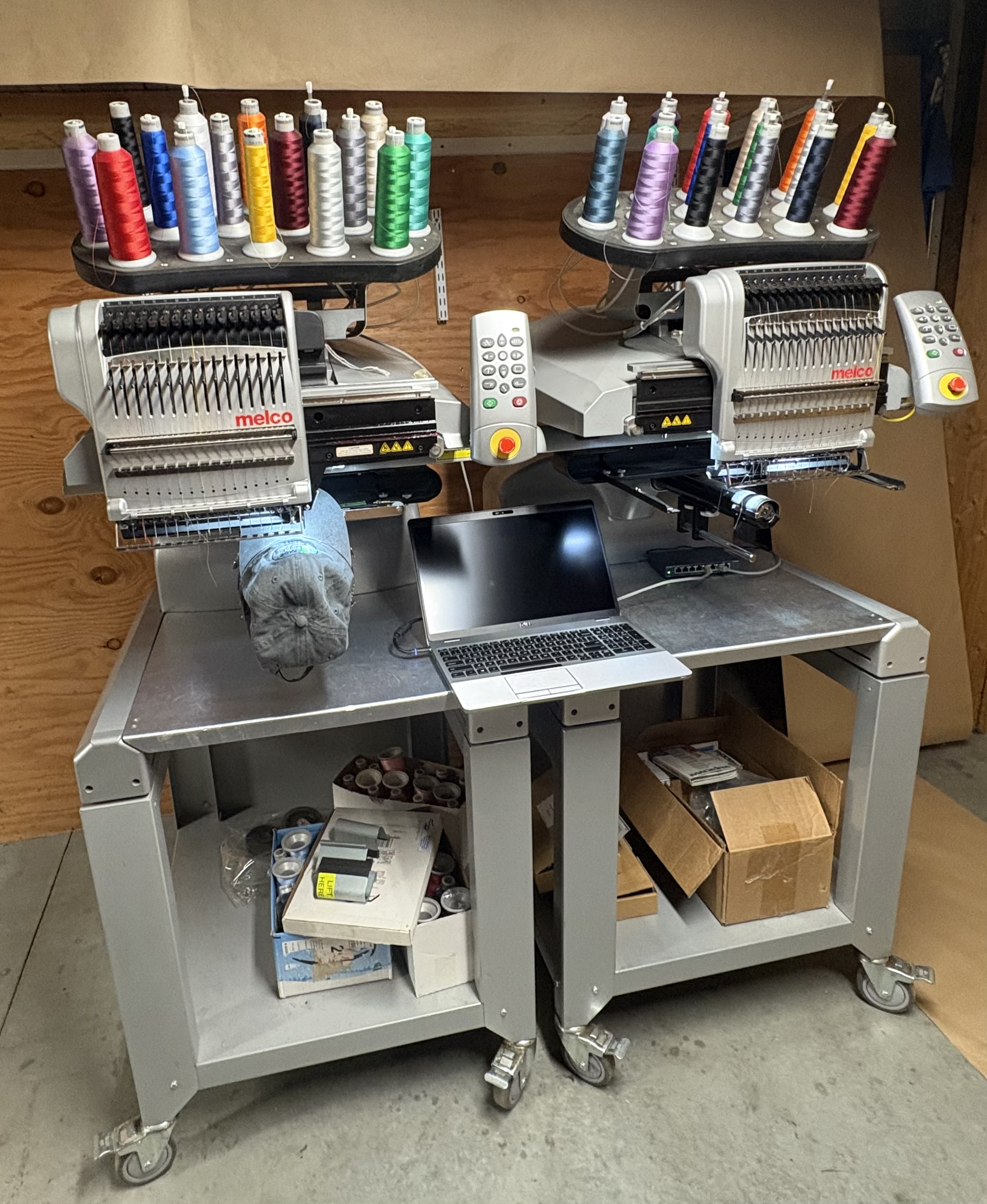 2 Melco EMT Embroidery Machines By tshirtlaura on Nov 03, 2025 Set of two Melco EMT 16 embroidery machines. Great running machines. Loon Lake, WA, United States
