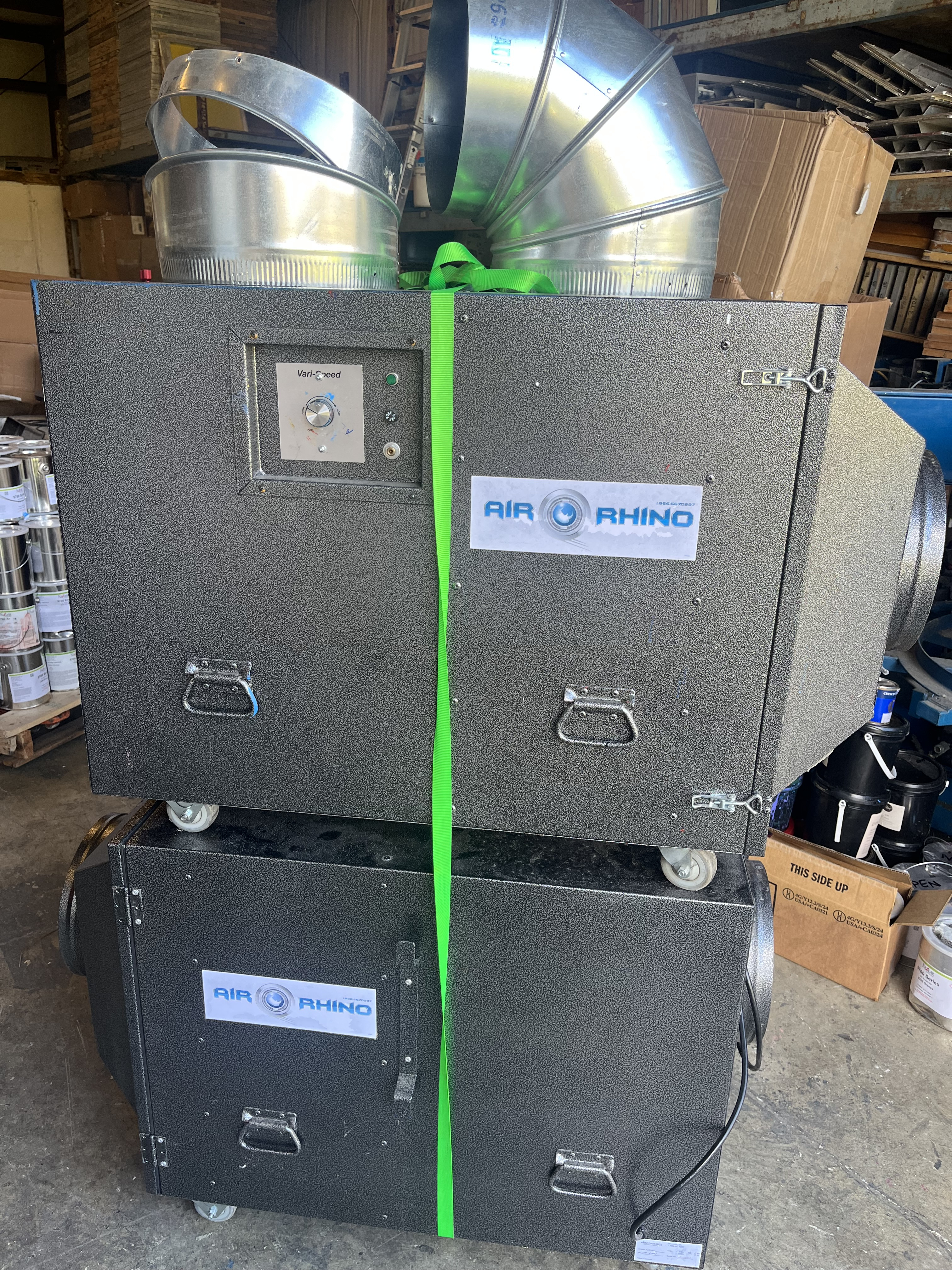 Delivering roughly 1800 CFM (2000 free flow), the Air Rhino is powerful enough for just about any industrial setting. This includes remediation, disaster relief and environmental clean-ups, as well as heavy duty manufacturing, construction and renovation. It can be used as a portable unit or placed in a fixed position for long term applications.