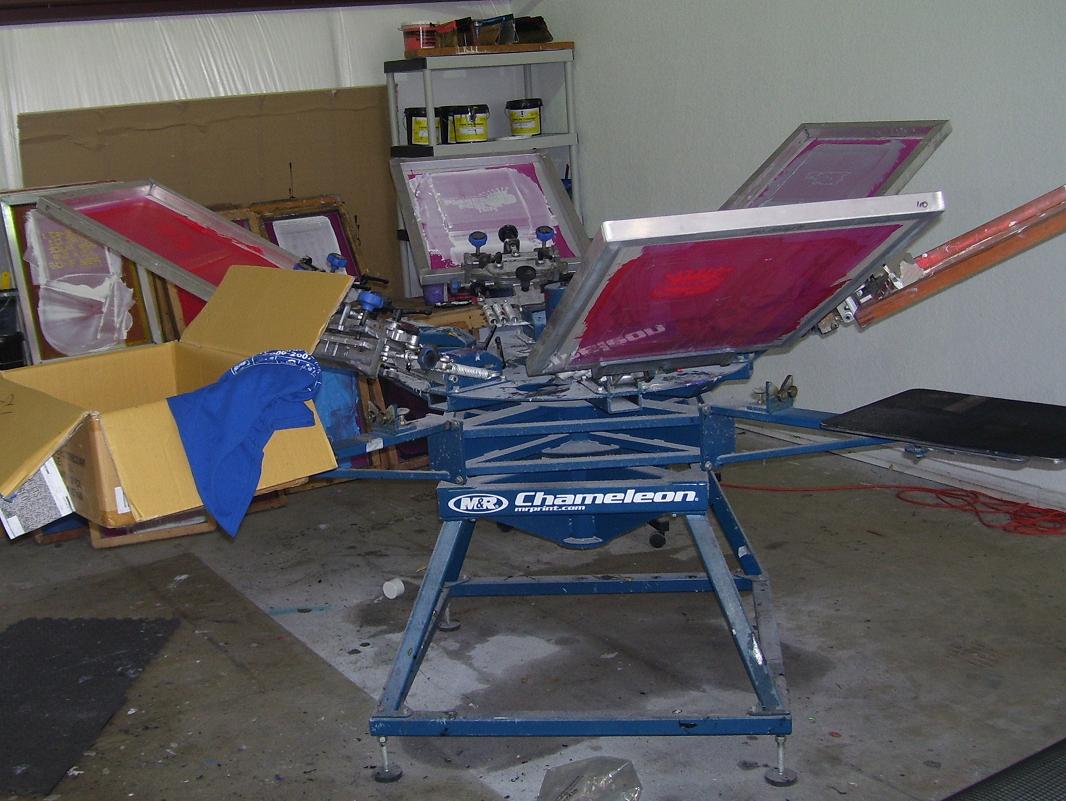 M&R 6 color 4 station press in great condition with conveyor dryer (220V). Included with sale will be Exposure unit, approx. 75 screens, Wide Format Printer for Film production, and a full shop of ink. Equipment is located near Jacksonville, FL. Please call 863-521-7964.