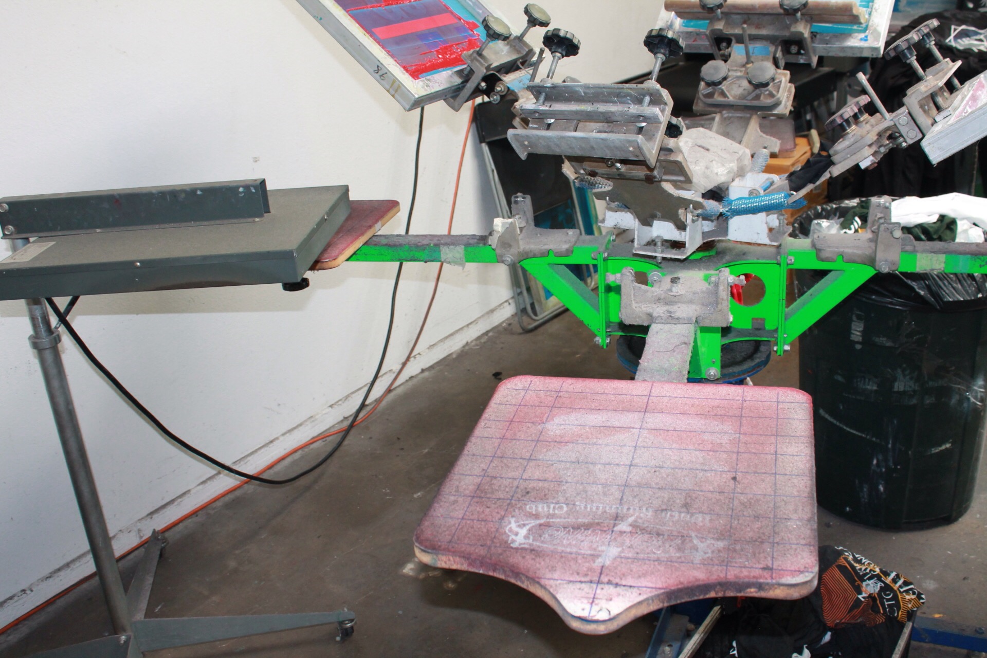 Riley Hopkins press. 4 color 4 station. Carousel press. Has micro registration. No issues holding registration. Works great. Comes with extra pallets for different size printing. Extra clamps for the arms so that switching pallets is easy.