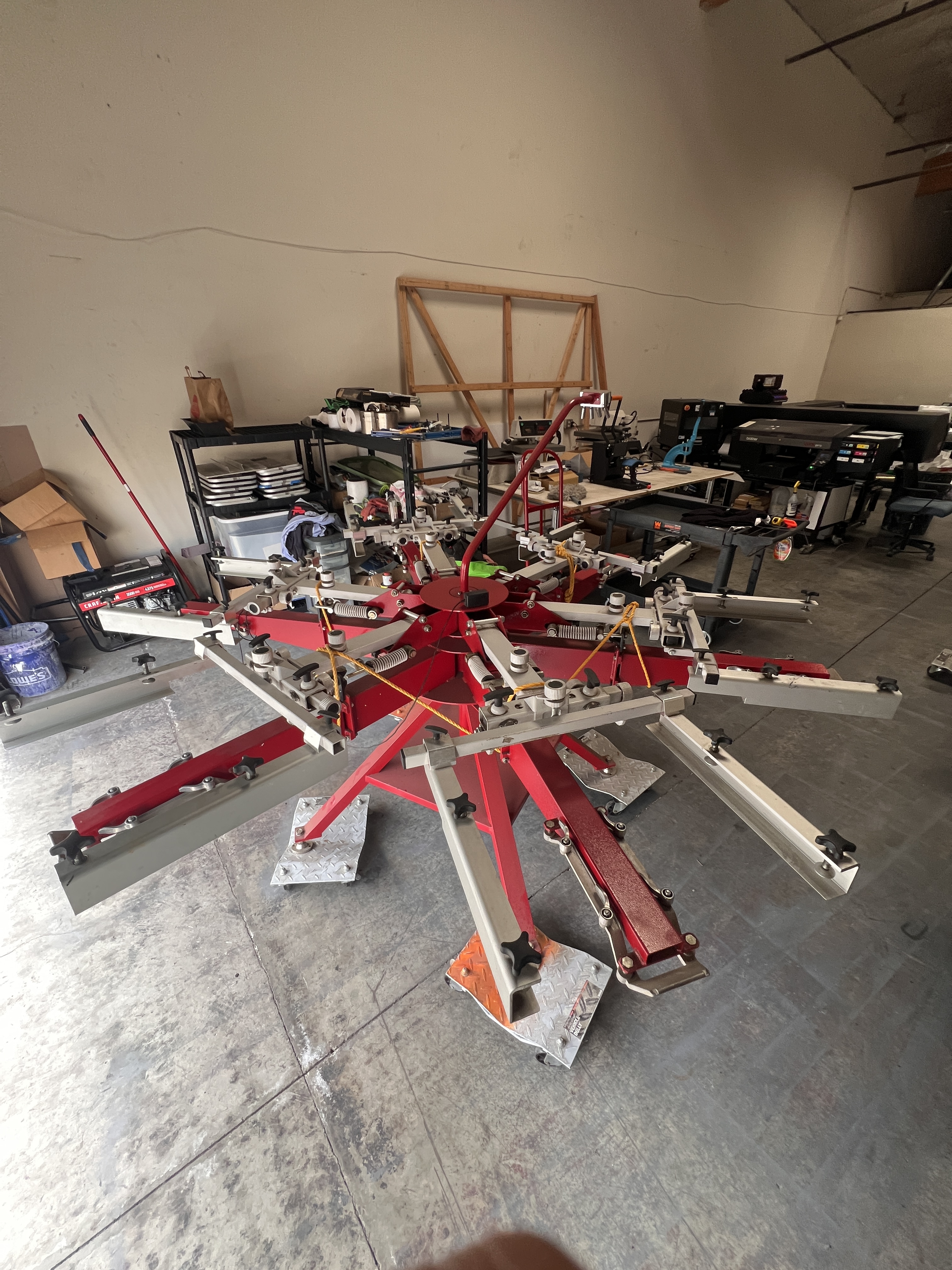 Hardly Used Anatol Thunder heavy duty, 6-color, 6-station manual screen printing press designed for high-volume production with industrial-grade durability. It features All Heads-Down printing, precise 3-point micro-registration, and side screen clamps for improved stability, typically handling screens up to 26" x 36". It is highly regarded for its smooth rotation and low fatigue operation.